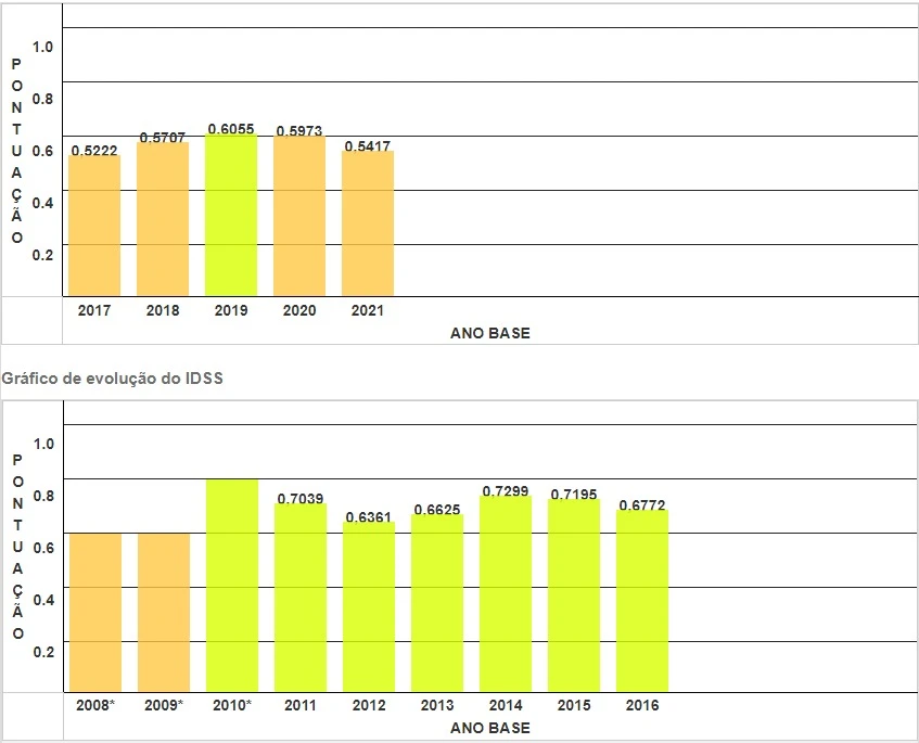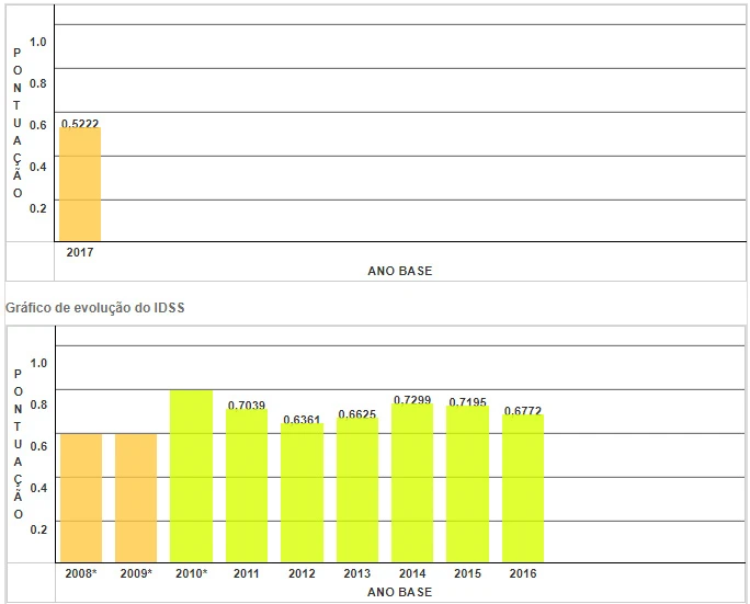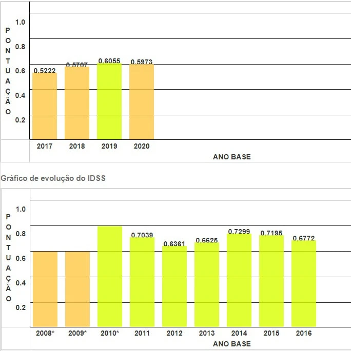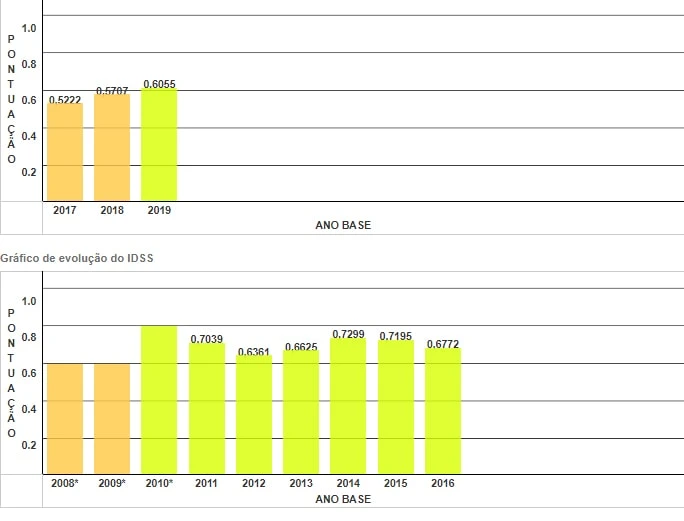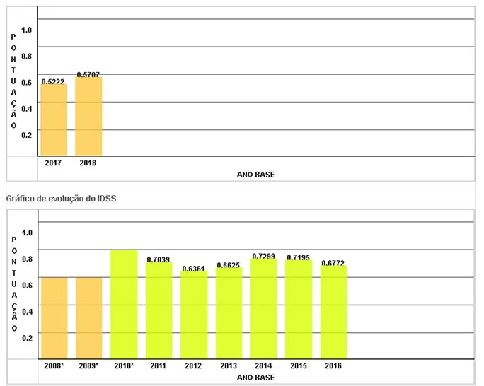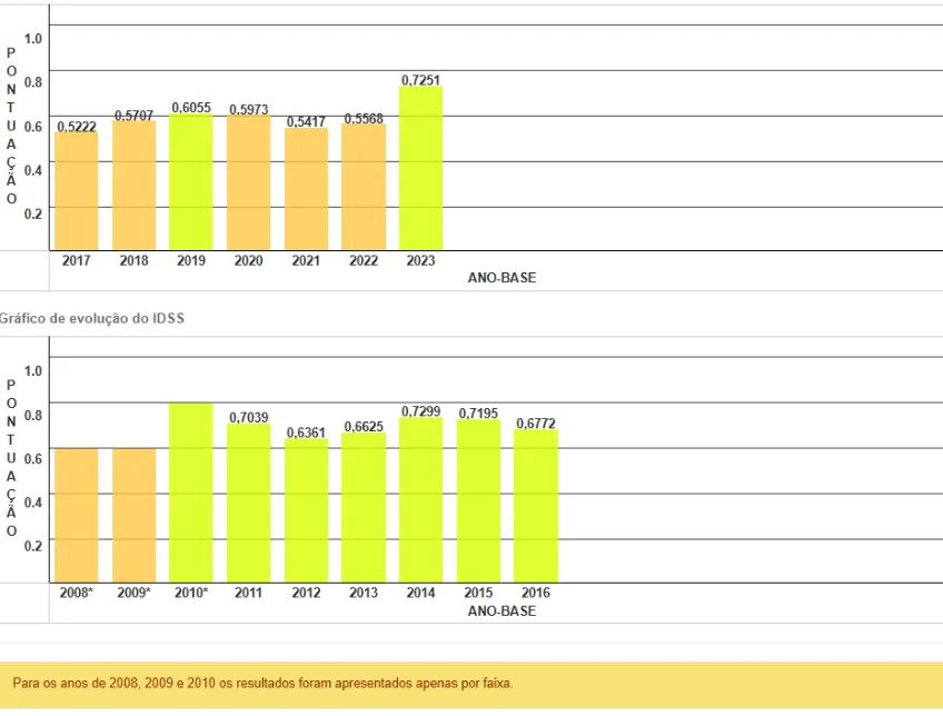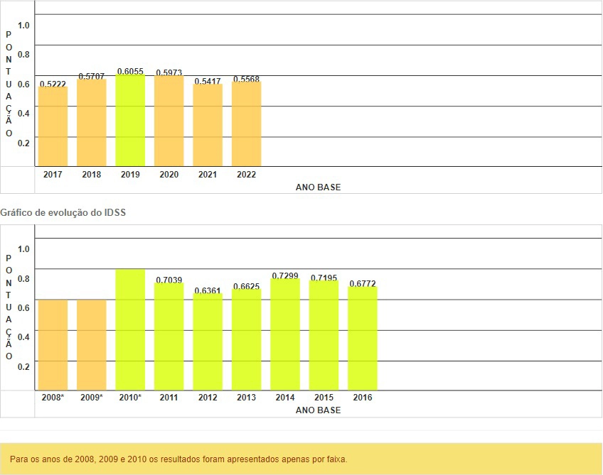 Gráfico de evolução do IDSS - TISSA ANS iniciou, a partir do IDSS ano-base 2017, uma nova etapa do Programa de Qualificação, que usa o Sistema de Informação do Padrão TISS (Troca de Informações na Saúde Suplementar) como fonte de dados para o processamento dos indicadores. A metodologia foi totalmente modificada, com os indicadores calculados sobre uma base de dados nova, gerando resultados que não são totalmente comparáveis com os anos anteriores.