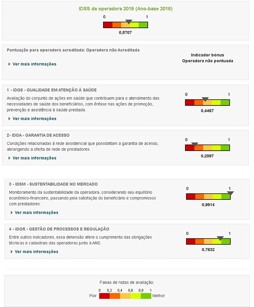 Os resultados da avaliação das operadoras são traduzidos pelo Índice de Desempenho da Saúde Suplementar (IDSS). O IDSS é um índice composto por um conjunto de indicadores agrupados em quatro dimensões e é calculado com base nos dados extraídos dos sistemas de informações da Agência ou coletados nos sistemas nacionais de informação em saúde.